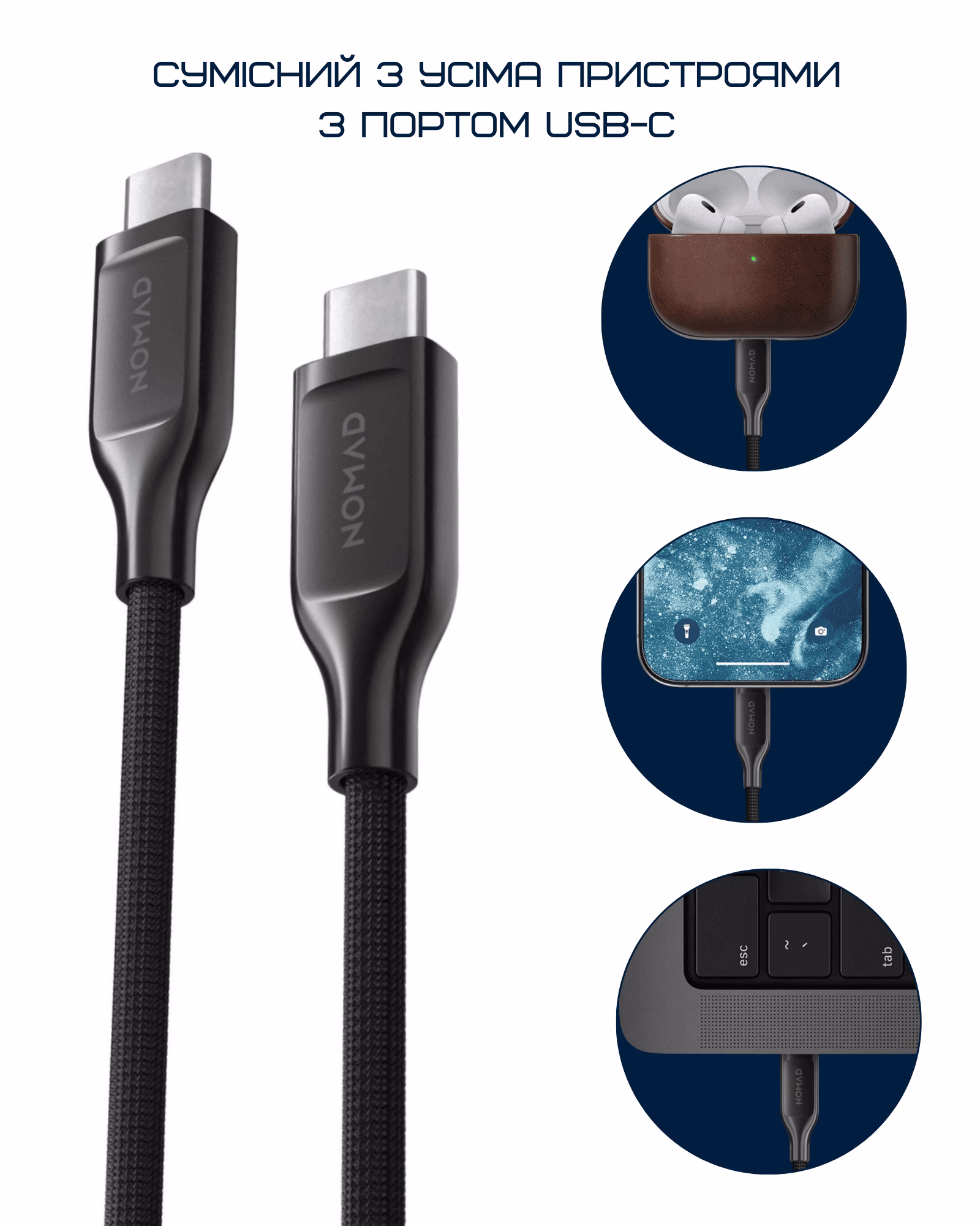 Благодаря поддержке мощности до 240 Вт, этот кабель обеспечивает быструю зарядку не только смартфонов или наушников, но и энергоемких устройств, таких как MacBook Pro или зарядные станции. В моменты, когда время имеет критическое значение, Nomad USB-C Kevlar Cable становится тем же скрытым козырем, что гарантирует: Вы всегда на шаг впереди.