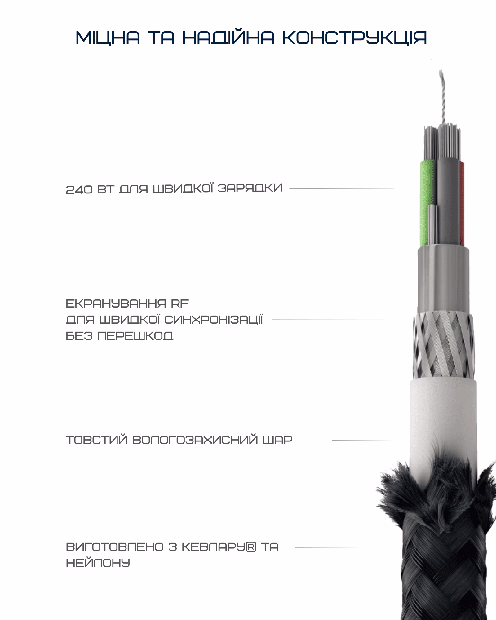 Забудьте о кабелях, которые рвутся в самый ответственный момент. Благодаря плетеной оболочке с армированными волокнами Kevlar® и гальваническим металлическим коннекторам, этот кабель создан для экстремальной выносливости. Литые разъемы не только придают визуальной эстетике, но и значительно повышают долговечность аксессуара. Он создан для тех, кто ежедневно бросает вызовы себе и оборудованию — и желает быть уверенным, что любая деталь выдержит этот ритм.