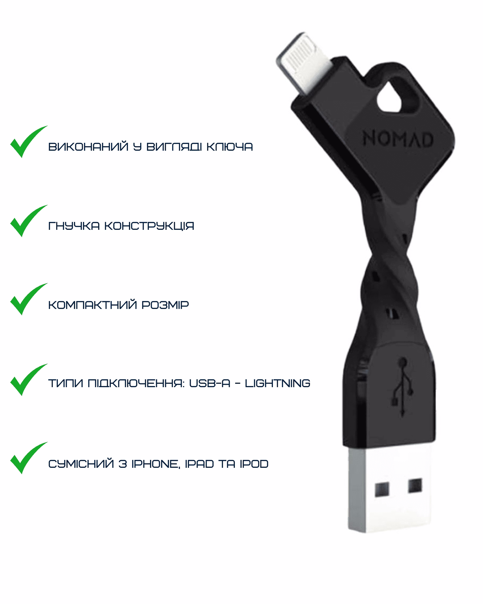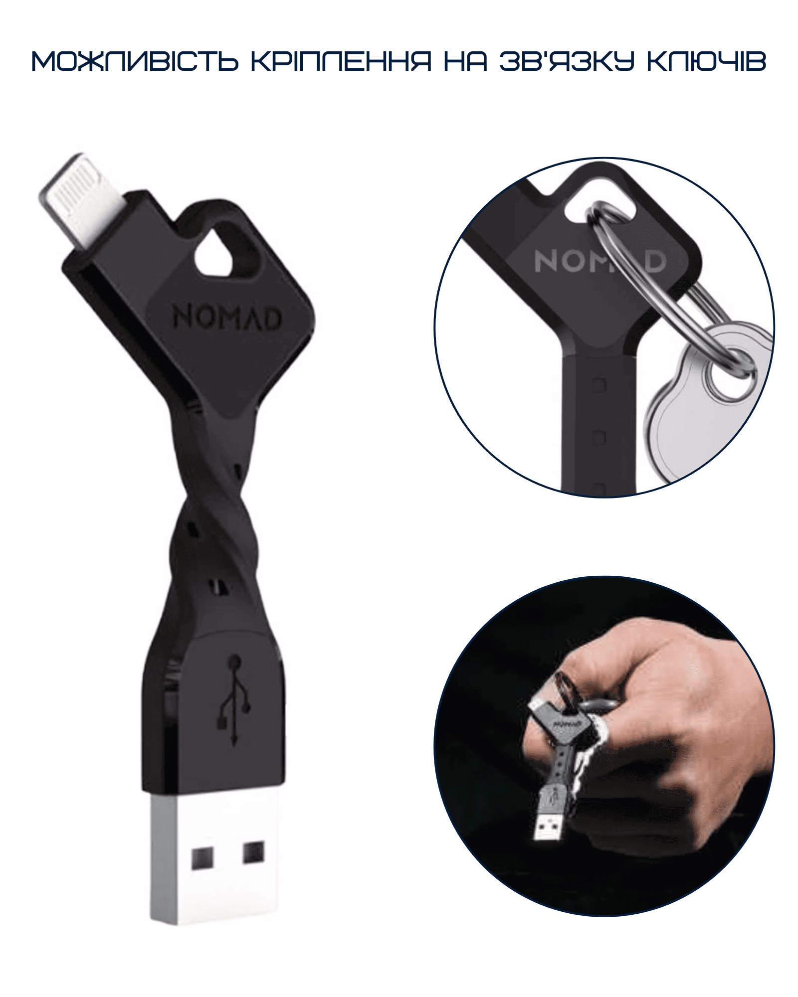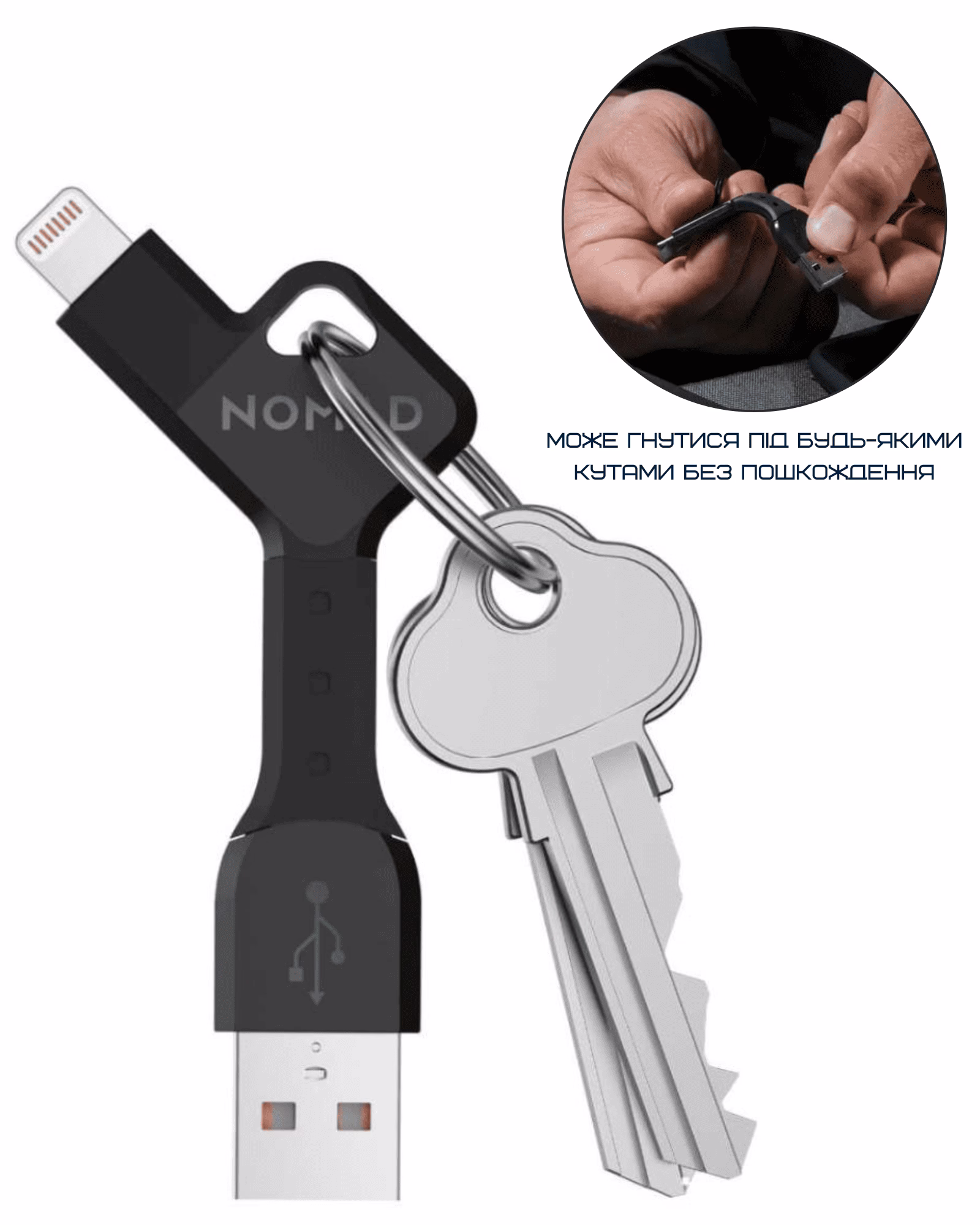 Опаздываетесь на важную встречу, а ваш телефон садится? Часто сталкиваетесь с проблемой, когда кабели ломаются или теряются? Nomad Key USB-A to Lightning — идеальное решение для всех владельцев техники Apple. Этот кабель сочетает стильный дизайн, компактность и высокую прочность, что позволяет носить его где угодно — в кармане, сумке или чехле для ключей. Он гнется под любым углом, не повреждается и всегда под рукой, когда нужно срочно зарядить устройство. Благодаря продуманному дизайну, вы больше не тратите время на поиски нового кабеля.