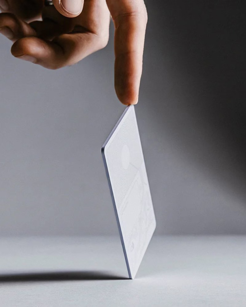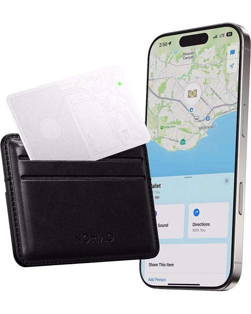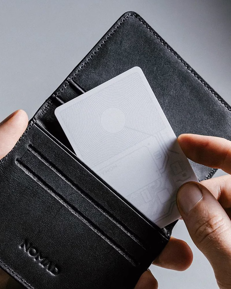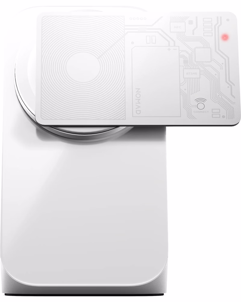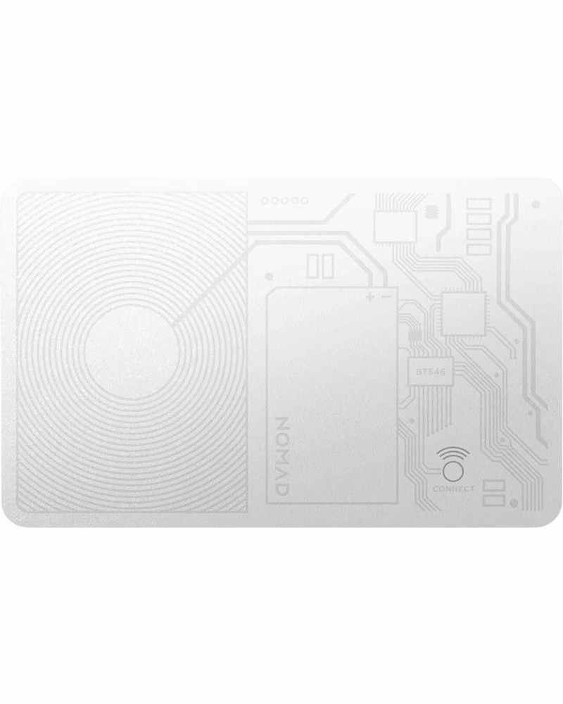 Nomad White — ультратонкая карта отслеживания с поддержкой Apple Find My. Поликарбонатный корпус, водозащита IPX7, заряда хватает до 5 месяцев, заряжается без проводов. Отлично подходит для кошелька или чехла.