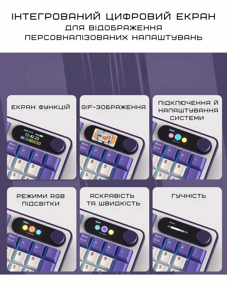 Да, клавиатура оснащена цветным TFT-экраном, который можно персонализировать, загружая GIF-анимации или статичные изображения через фирменное программное обеспечение RK. Экран также отображает время, уровень заряда батареи и режим подключения. Обратите внимание, что программное обеспечение доступно только для Windows, и некоторые пользователи сообщают о его нестабильной работе.5. Особенности использования: