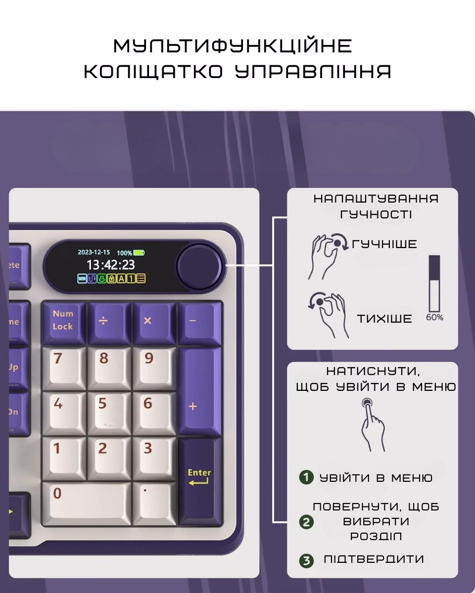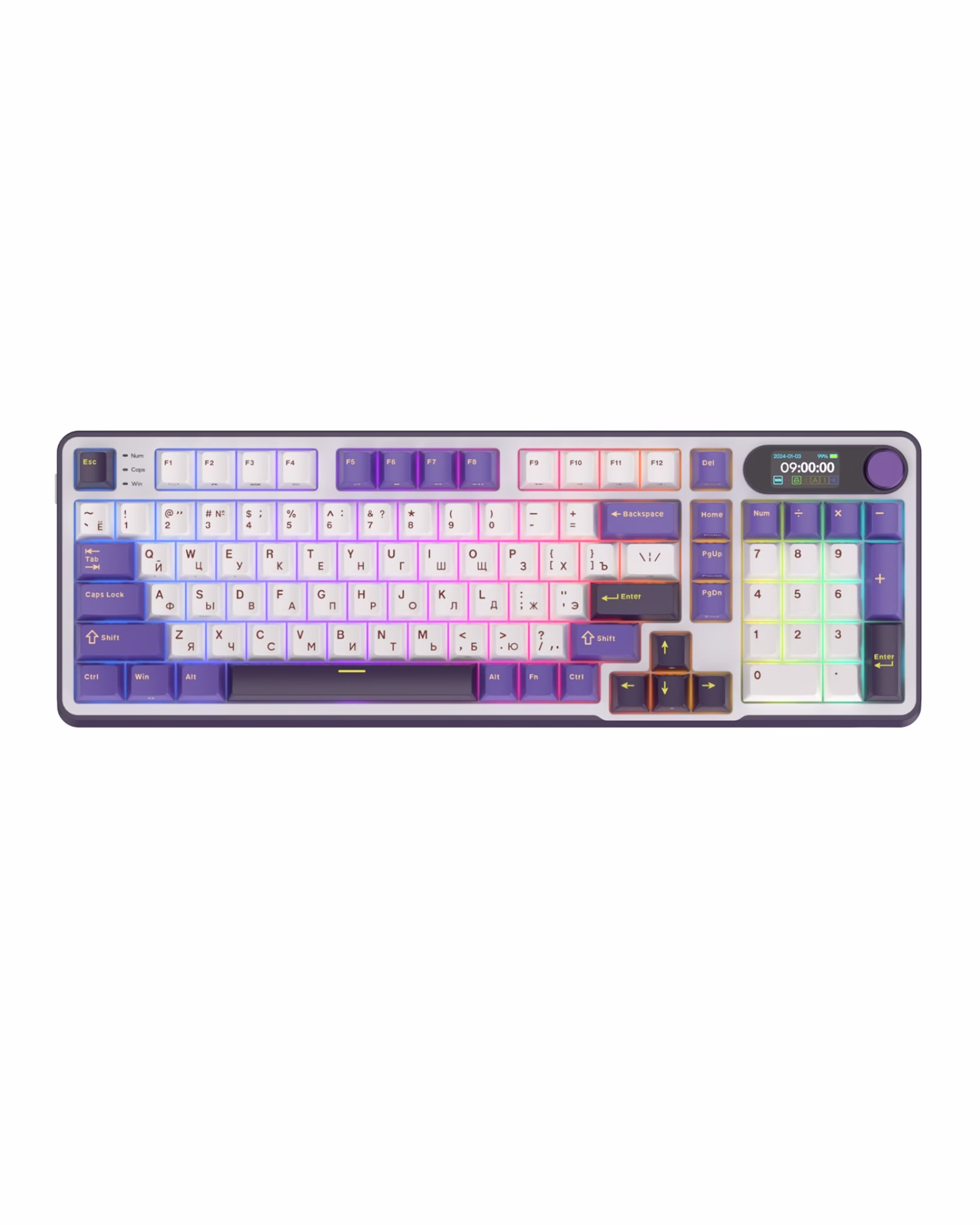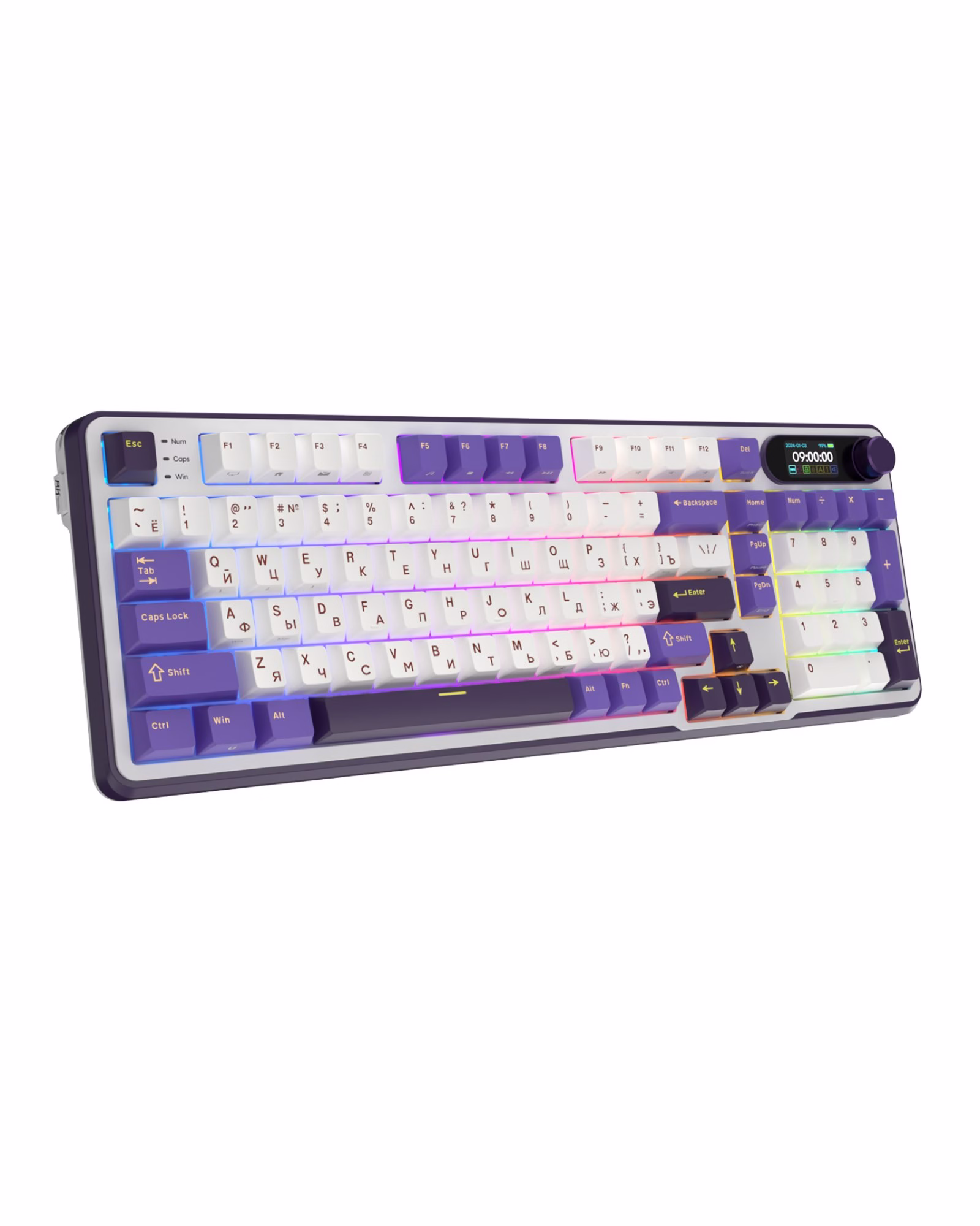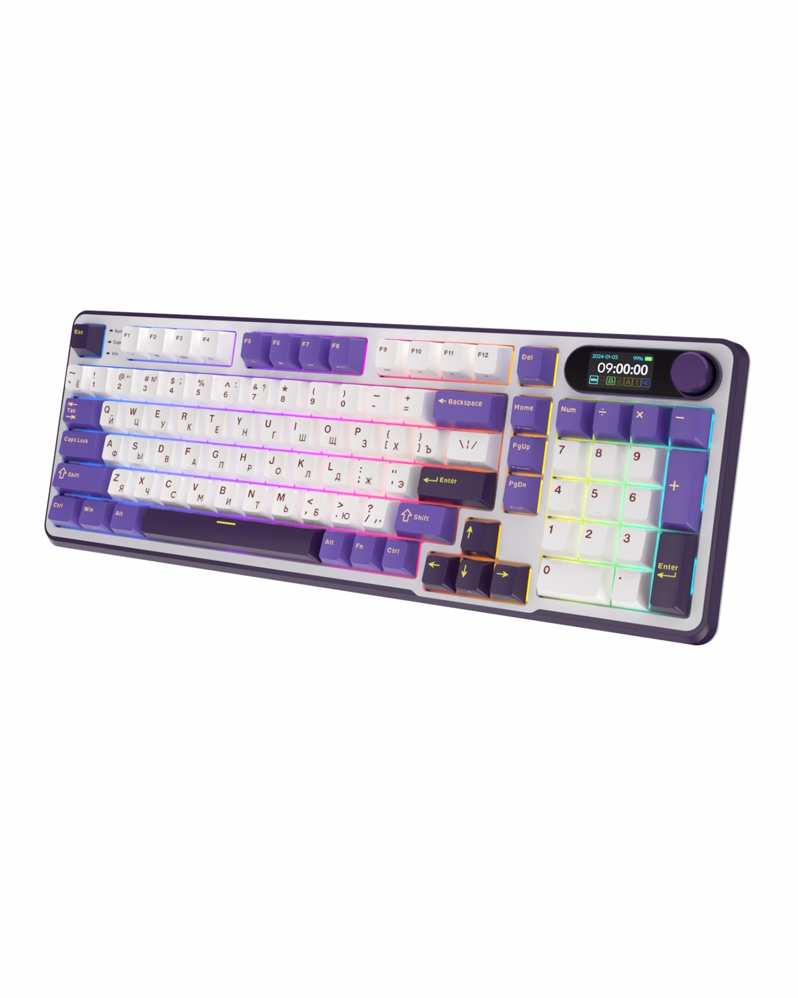 - Интегрированный мини‑экран и кастомизированное колесо: для отображения уровня заряда, режима подсветки или персонализированных картинок. Колесо регулирует громкость или яркость, а также переключает функции работы клавиатуры