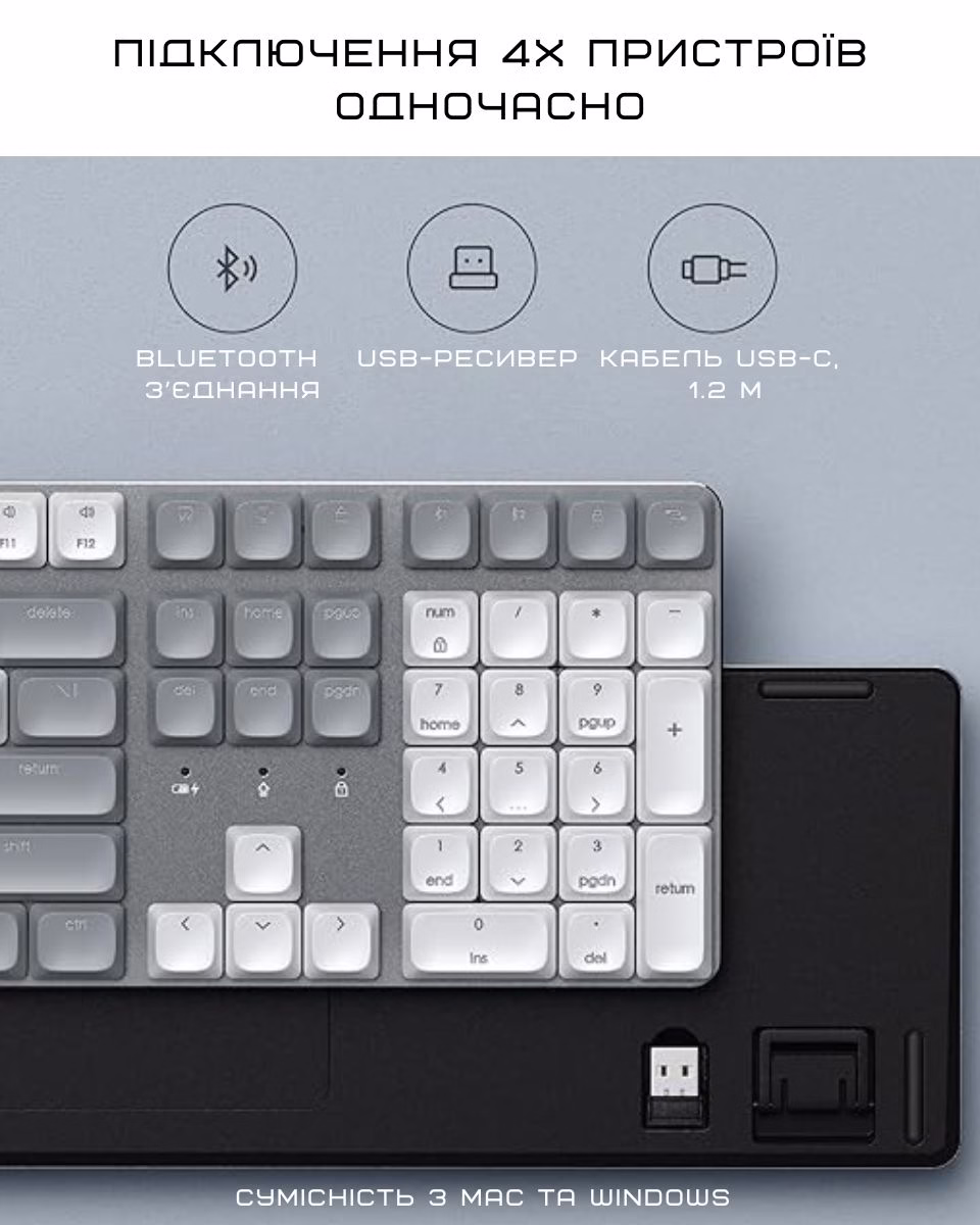 Подключай сразу до четырёх устройств и легко переключайся между ними — теперь твой рабочий процесс становится плавным и бесперебойным. Благодаря двум каналам Bluetooth 5.0, USB-приёмнику и стабильному проводному подключению эта клавиатура подстраивается под тебя, а не ты под неё.