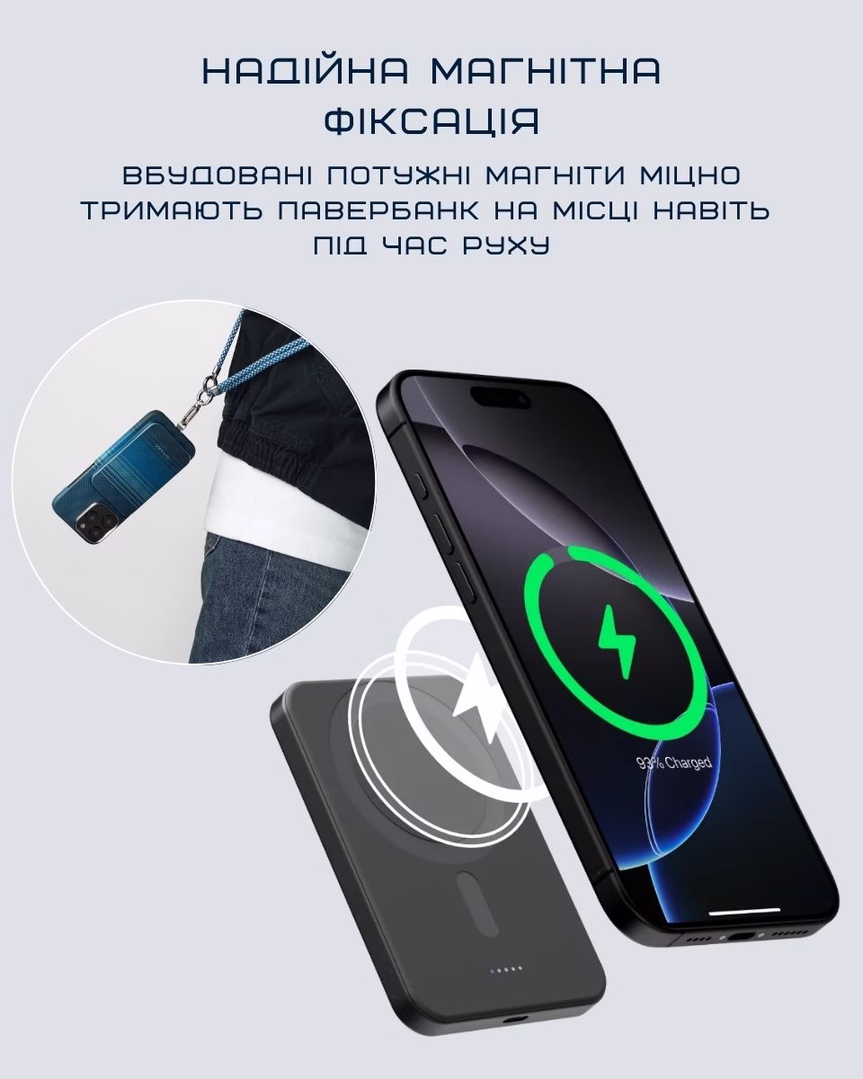 Встроенные мощные магниты надёжно фиксируют павербанк на задней панели iPhone. Он не смещается во время движения, не выпадает из сумки и не мешает использованию телефона. Благодаря этому зарядка остаётся стабильной и комфортной в разных повседневных ситуациях.