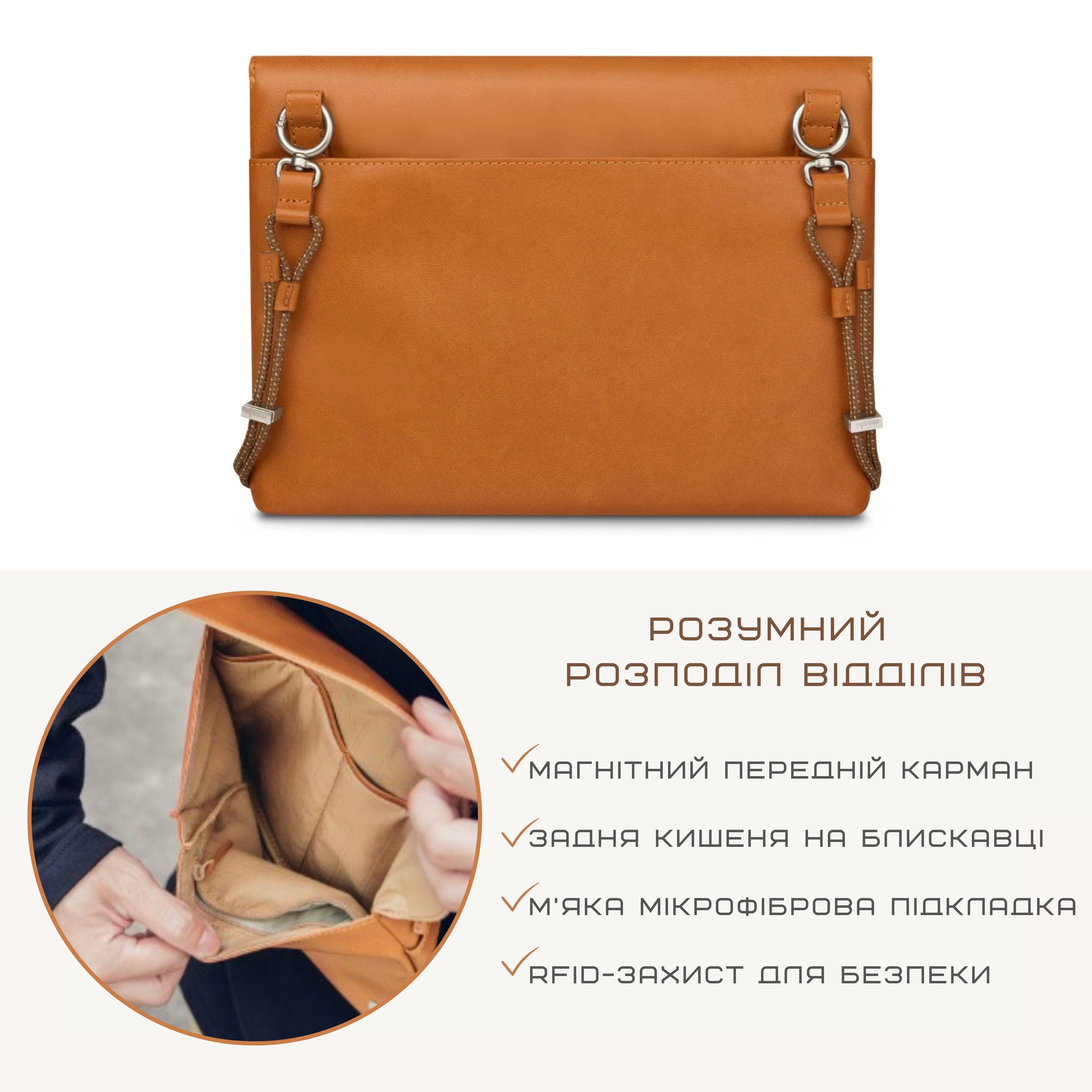 Устойчивость к непогоде и случайным разливам - специальное покрытие сохраняет свой вид при любой погоде, будь то дождь, снег или яркое солнце. Мягкая подкладка из микрофибры защищает от царапин, а магнитный карман обеспечивает быстрый доступ к содержимому, оставаясь незаметным в людных местах.