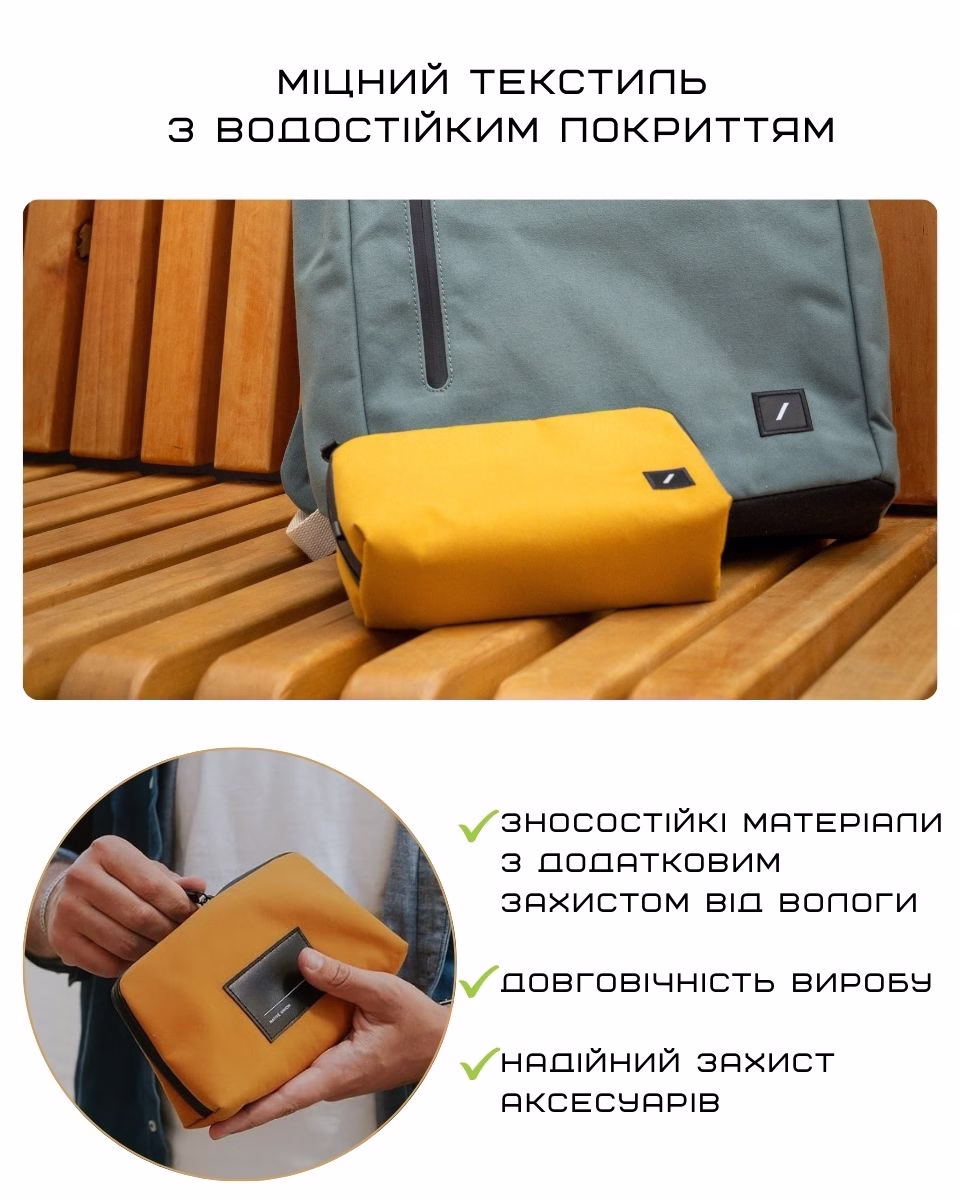 - Прочная текстильная поверхность с водоотталкивающим покрытием защищает аксессуары от влаги и износа.