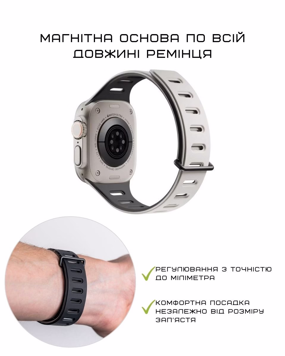 Ремешок моментально застёгивается благодаря встроенным магнитам по всей длине. Его легко надеть, удобно носить, он надёжно держится. А полностью магнитная конструкция позволяет точно подогнать длину под себя — с точностью до миллиметра. Дополнительная магнитная застёжка удерживает всё на месте даже во время активных движений.