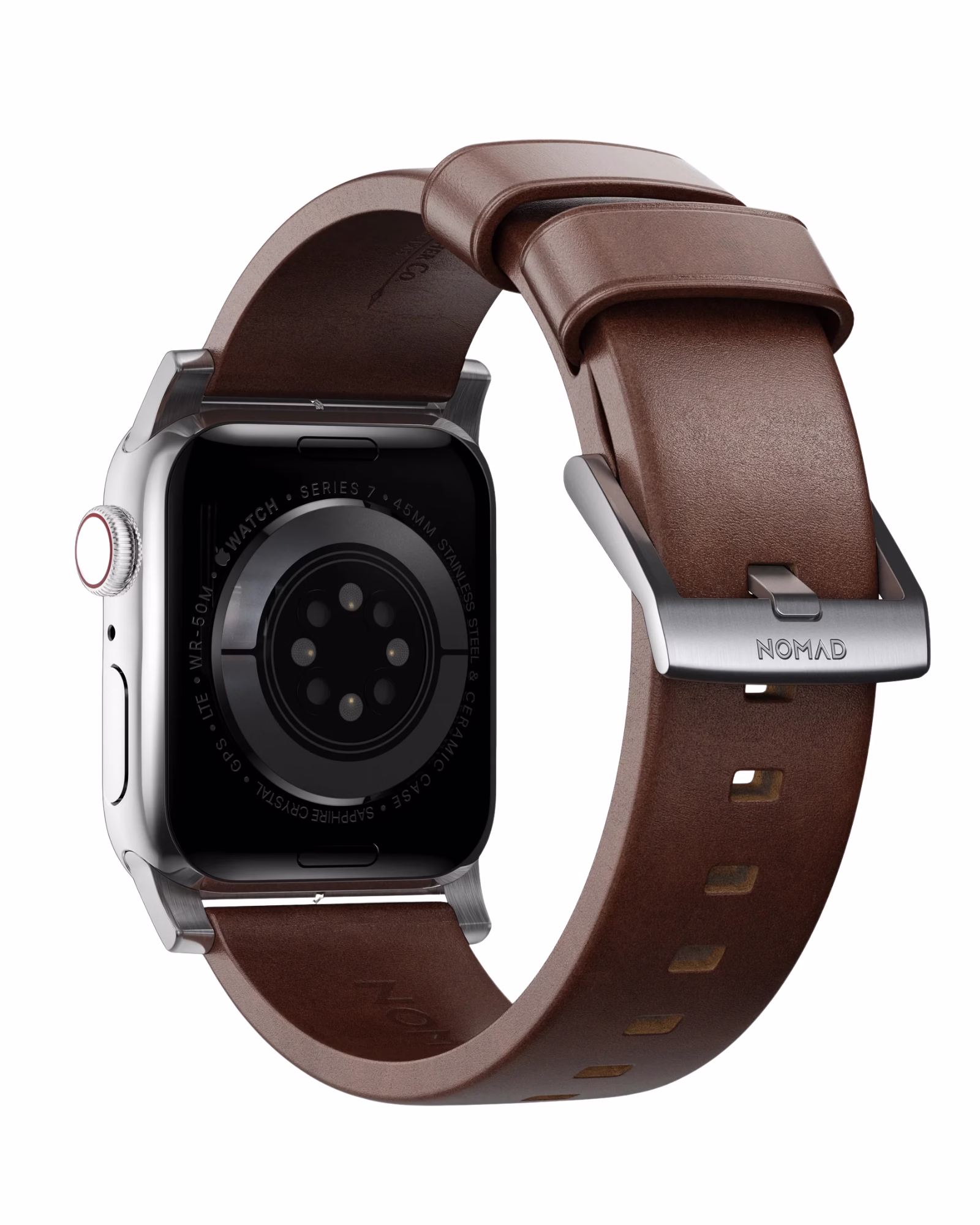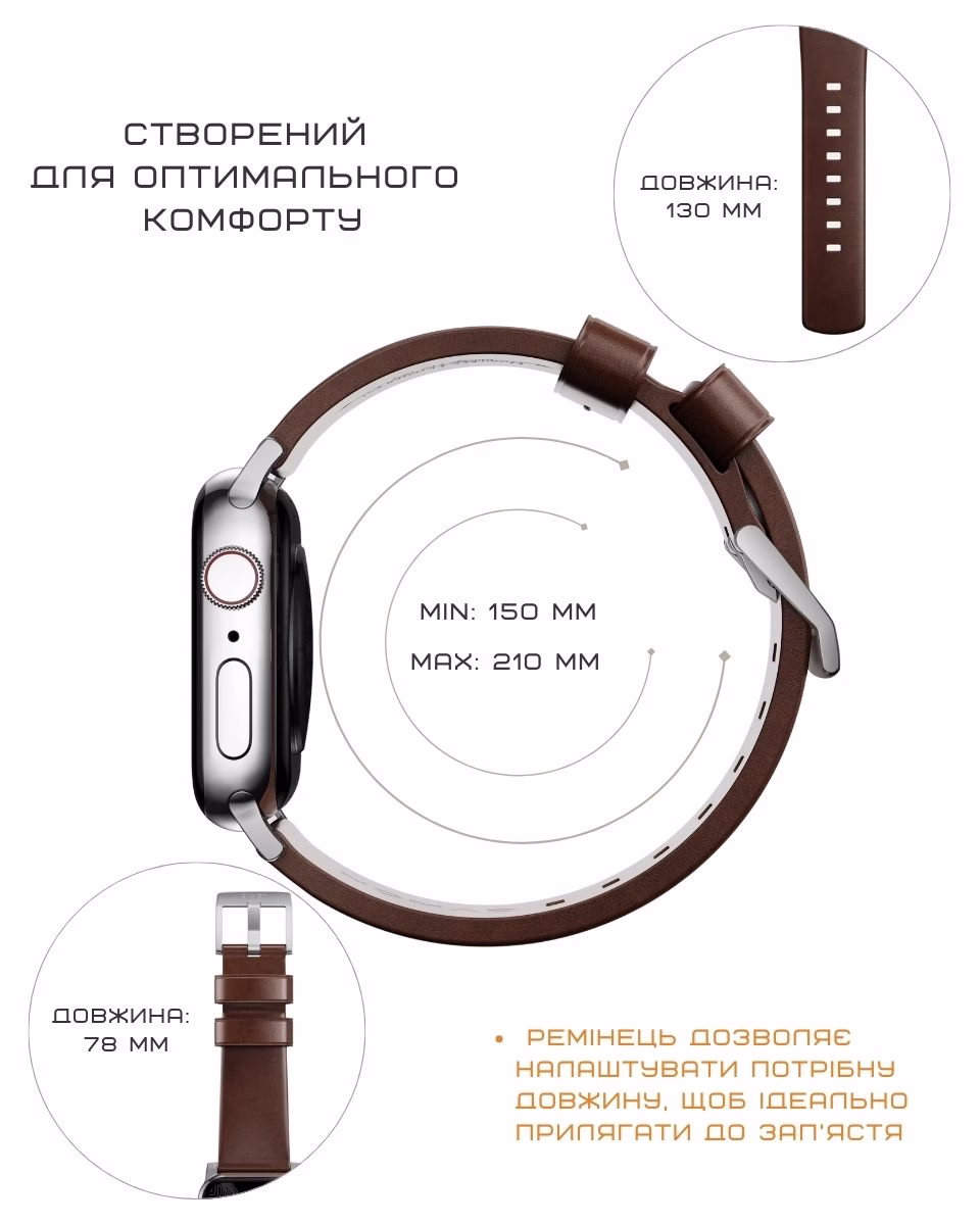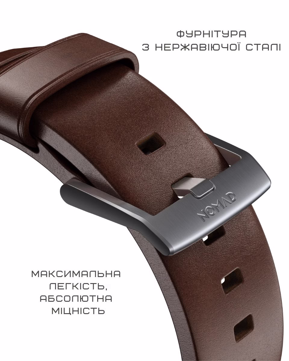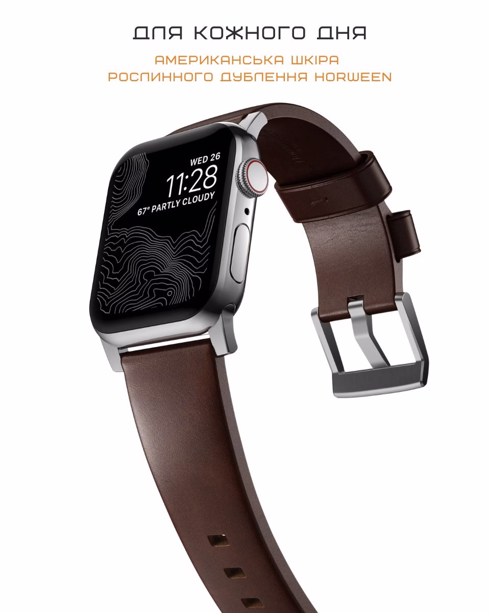Кожаный ремешок от Nomad — это сочетание классики и современного стиля для твоих Apple Watch. Он уместно смотрится как с повседневной одеждой, так и с деловым образом. Удобно сидит на запястье, не натирает и надежно фиксируется.