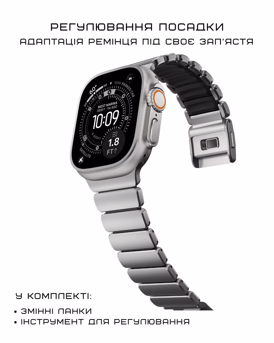 Посадка — це те, що визначає, наскільки ремінець буде зручним для запʼястя. У Stratos Band її можна точно підлаштувати під себе. У комплекті є дві ланки половинного розміру. Вони дозволяють налаштувати індивідуальну довжину і знайти комфортну посадку під зап’ястя.