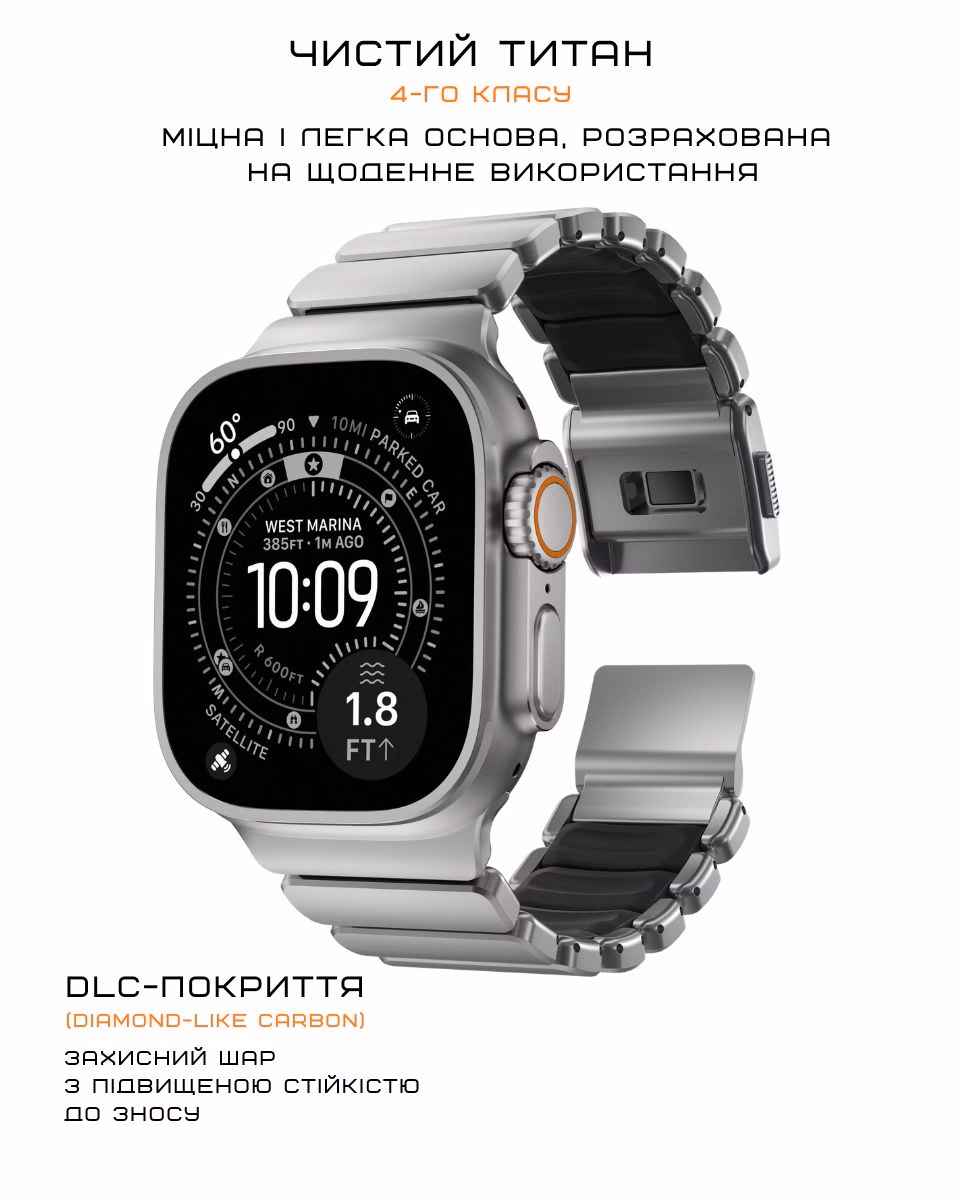 Титанові ланки ремінця мають DLC-покриття (Diamond-Like Carbon) — це тонкий захисний шар на основі вуглецю, який за властивостями частково нагадує алмаз. Його наносять на поверхню титану, щоб підвищити зносостійкість і зберегти вигляд матеріалу протягом тривалого використання.