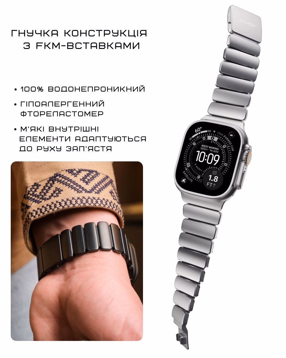 Фтореластомер відповідає за гнучкість і м’якість. Це матеріал, який стабільно поводиться в різних умовах: не боїться вологи, не вбирає піт і зберігає свої властивості з часом. З внутрішньої сторони ремінця передбачені м’які вставки з цього матеріалу. Вони мають М-подібну форму, яка трохи піднімає їх над титановою основою і створює простір між ремінцем і зап’ястям.