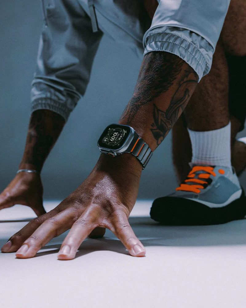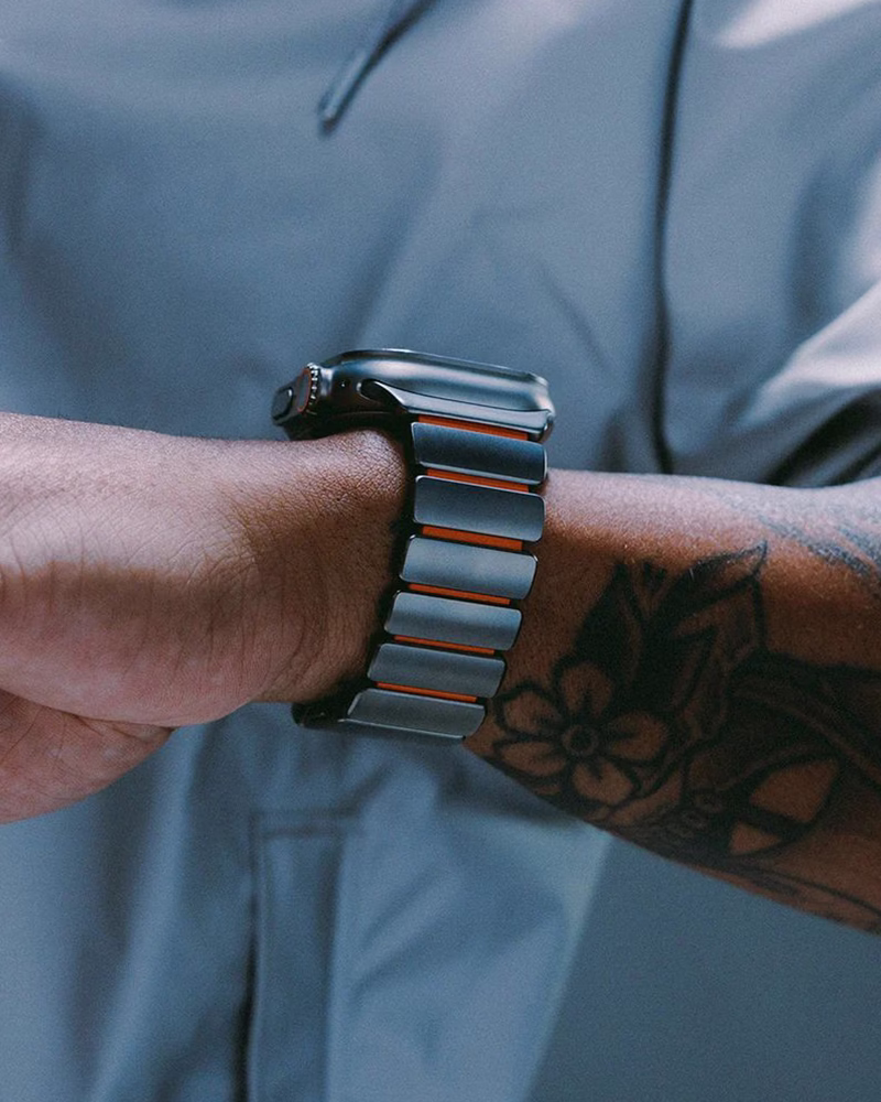 Stratos Band выполнен из титановой фурнитуры Grade 4 и звеньев FKM, которые дают естественную гибкость. Магнитная застежка N52 обеспечивает надежную фиксацию на запястье. Ремешок водостойкий, подходит для активностей и ношения в течение дня. В комплекте есть инструмент для регулировки длины.