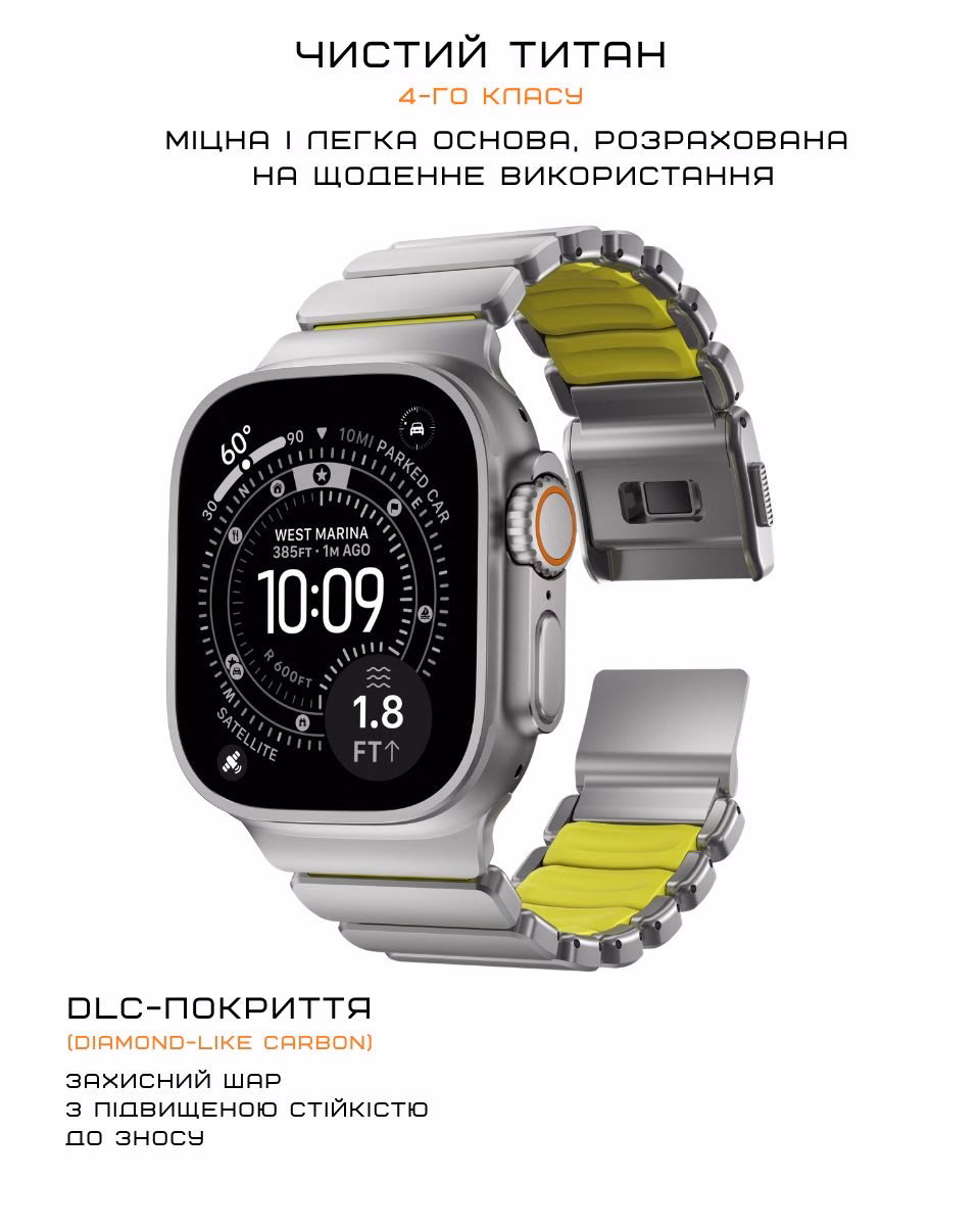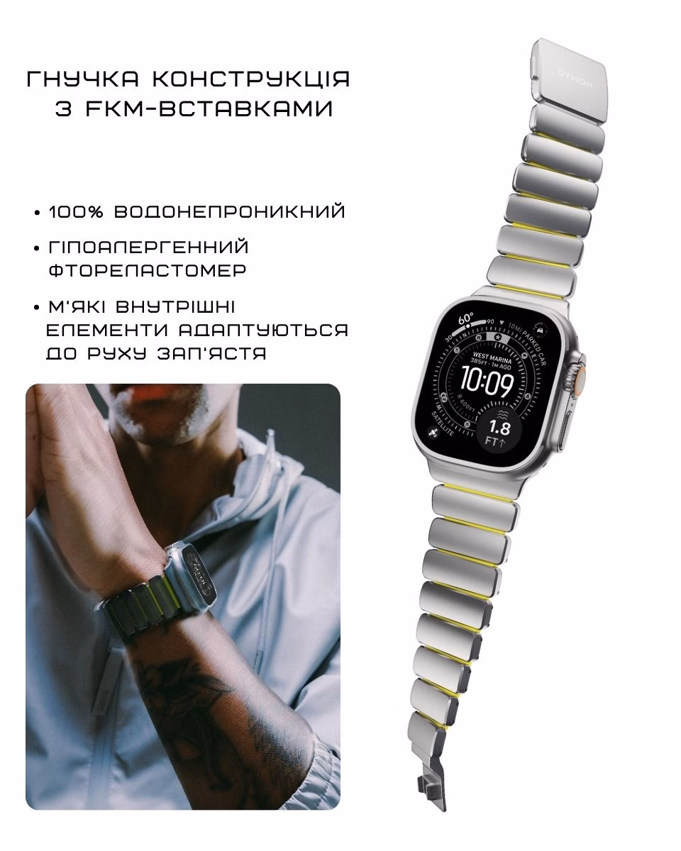 Фтореластомер відповідає за гнучкість і м’якість. Це матеріал, який стабільно поводиться в різних умовах: не боїться вологи, не вбирає піт і зберігає свої властивості з часом. З внутрішньої сторони ремінця передбачені м’які вставки з цього матеріалу. Вони мають М-подібну форму, яка трохи піднімає їх над титановою основою і створює простір між ремінцем і зап’ястям.