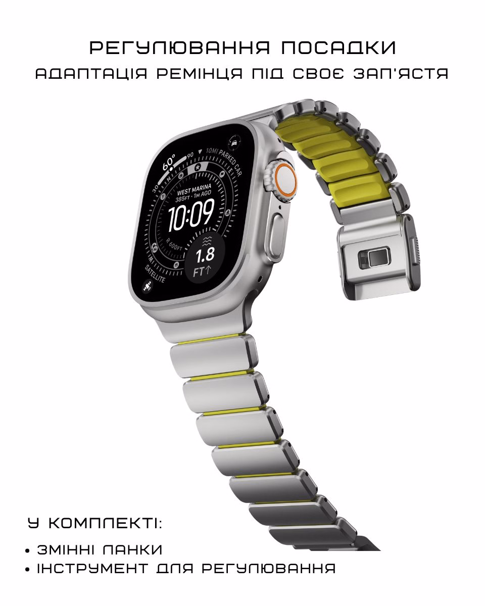 Посадка — це те, що визначає, наскільки ремінець буде зручним для запʼястя. У Stratos Band її можна точно підлаштувати під себе. У комплекті є дві ланки половинного розміру. Вони дозволяють налаштувати індивідуальну довжину і знайти комфортну посадку під зап’ястя.