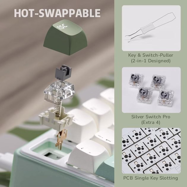 Быстрые, точные и приятные на ощупь переключатели. Они мгновенно реагируют на каждый движок пальцев и обеспечивают плавный, «кремовый» ход без лишних звуков. Подходят для тех моментов, когда ты погружаешься в игру или работу, и важно, чтобы клавиши ощущались легкими, работали точно и не отвлекали ненужными шумами. Легко изменить ощущения от нажатия клавиш, самостоятельно установив другие переключатели. Пайка при этом не требуется, инструмент для замены идет в комплекте.
