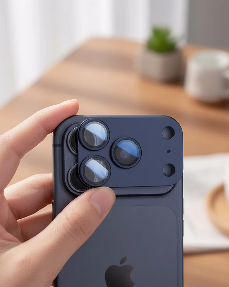 Anank All-in-One — это цельный защитный модуль для блока камер iPhone 17 Pro Max. Он сочетает закаленное стекло и прочную алюминиевую рамку в цвете Deep Blue. Благодаря AR-покрытию, защита не искажает фото и уменьшает блики, надежно оберегая линзы от ударов.