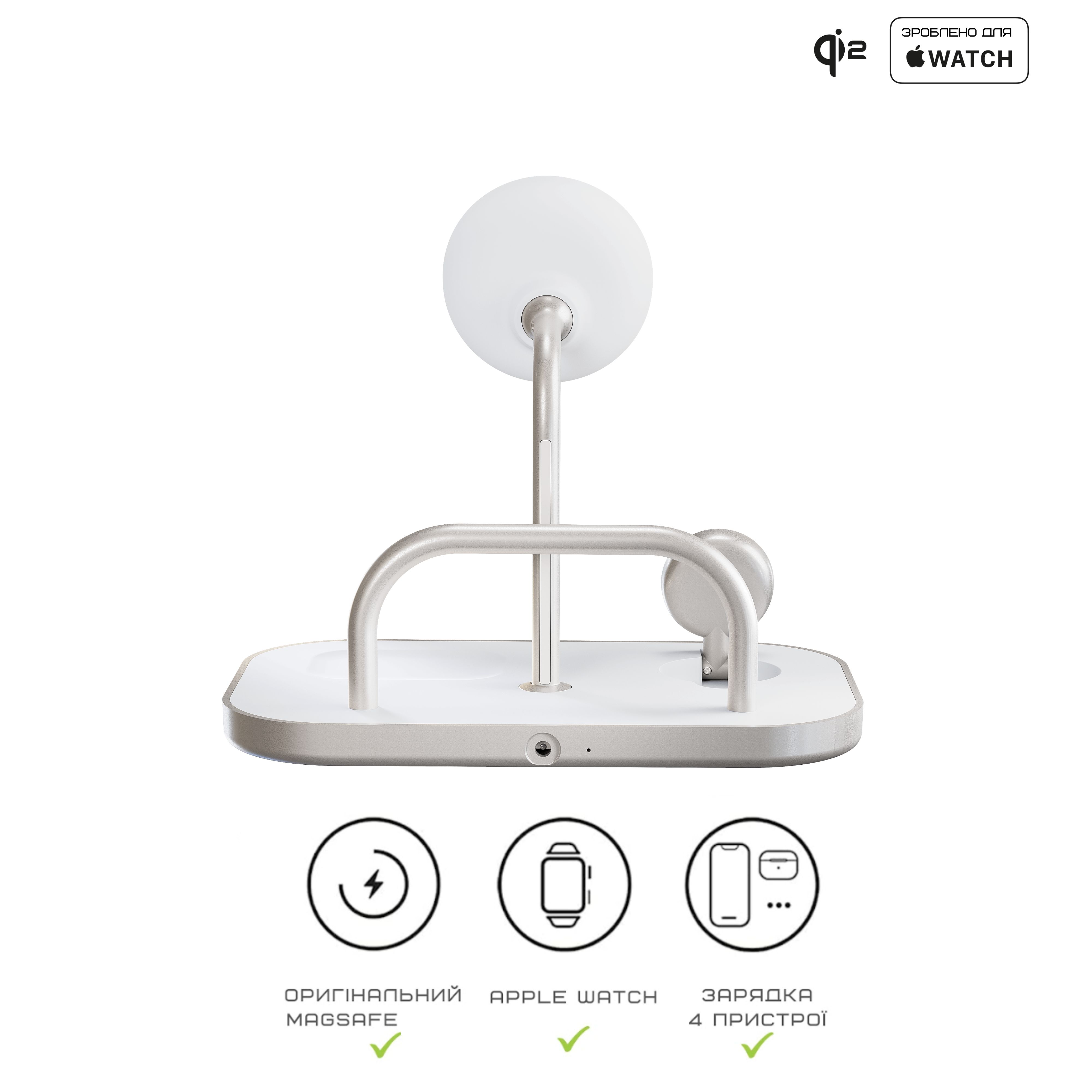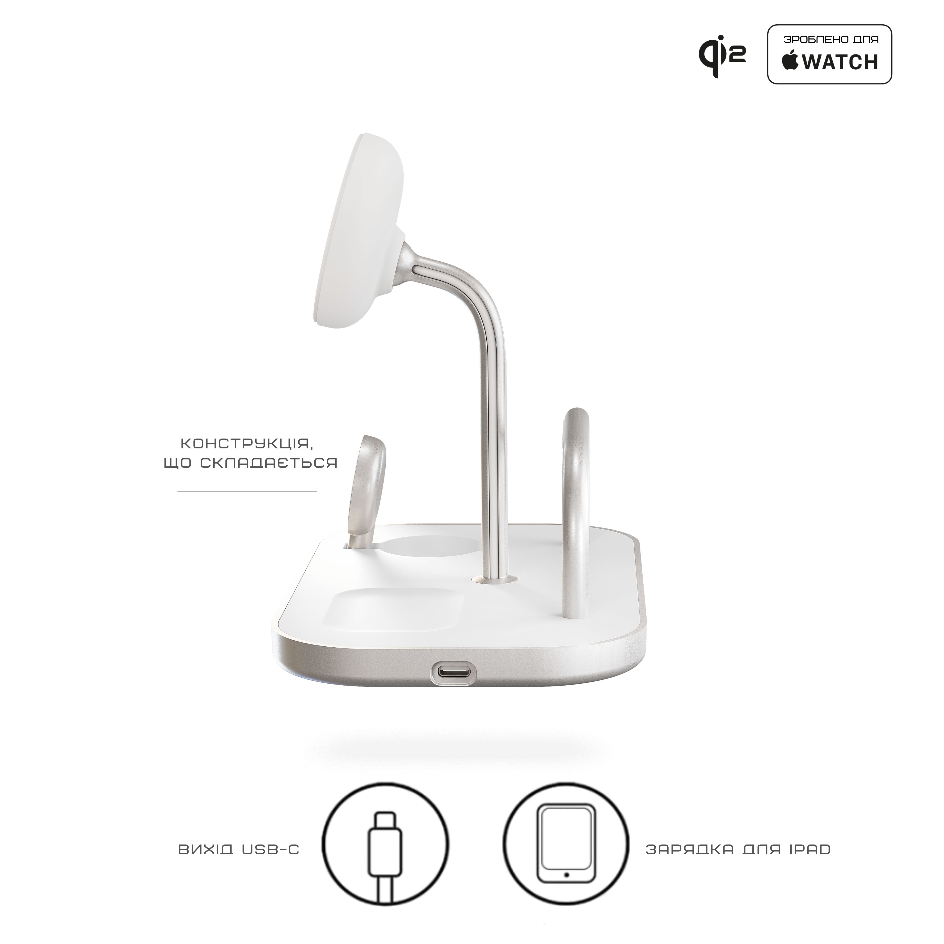 Официальная сертификация MagSafe гарантирует быстрое и безопасное питание iPhone и Apple Watch. Дополнительная панель Qi подходит для AirPods 2/3, AirPods Pro и других совместимых устройств, а порт USB-C обеспечивает возможность одновременной зарядки ещё одного гаджета.